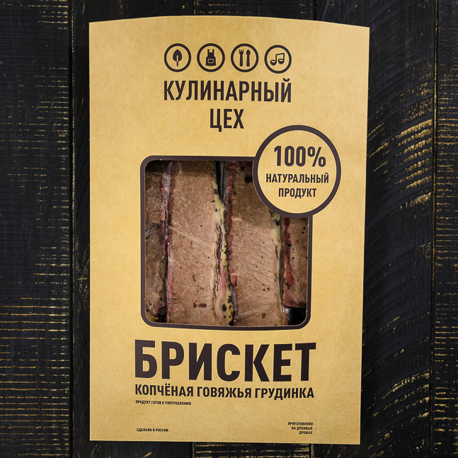 Мясной царь вашего стола! Брискет, приготовленный при низких температурах (около 90 градусов) на протяжении длительного времени (12-18 часов) с использованием передовых технологий копчения на дубовых дровах.