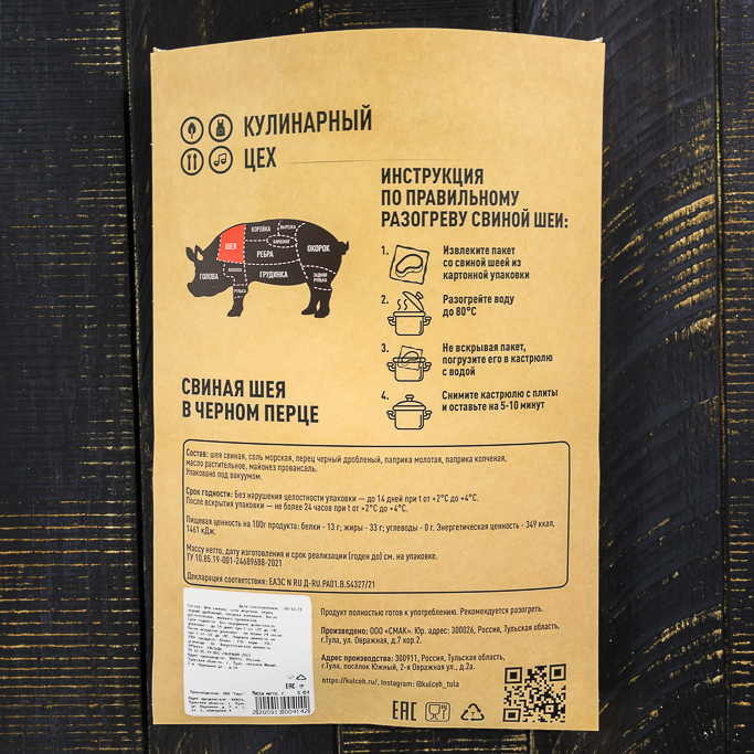Состав: шея свиная, соль, перечная смесь дробленая, черный перец молотый, паприка молотая, паприка копченая, соевый соус, масло растительное