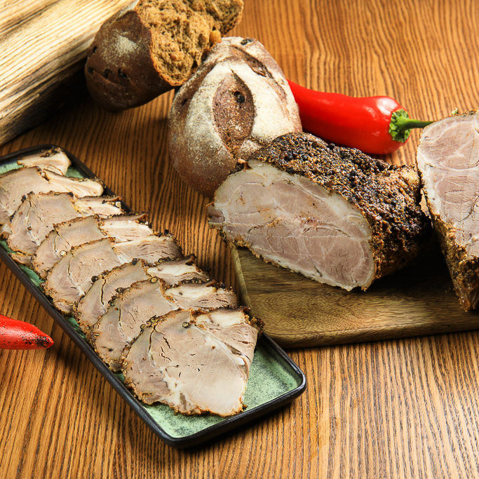 Сочный и нежный кусок свинины, томленый при низких температурах и доведенный до готовности в нашем фирменном смокере. С добавлением зернистой горчицы и салатных листьев - основа мясной нарезки, сэндвича или салата.