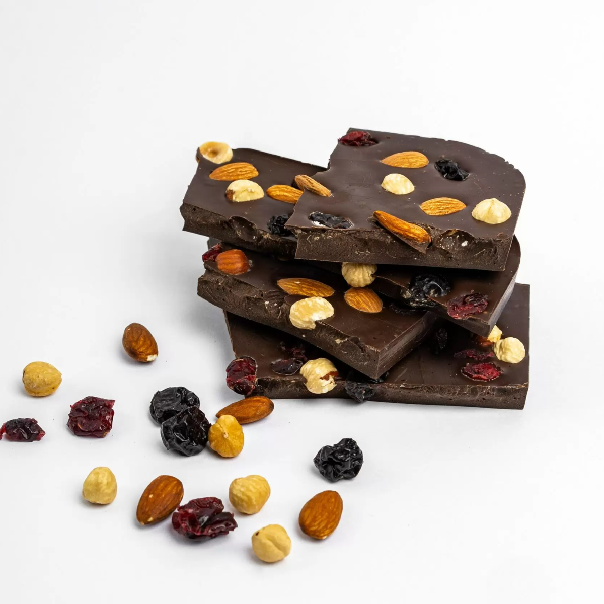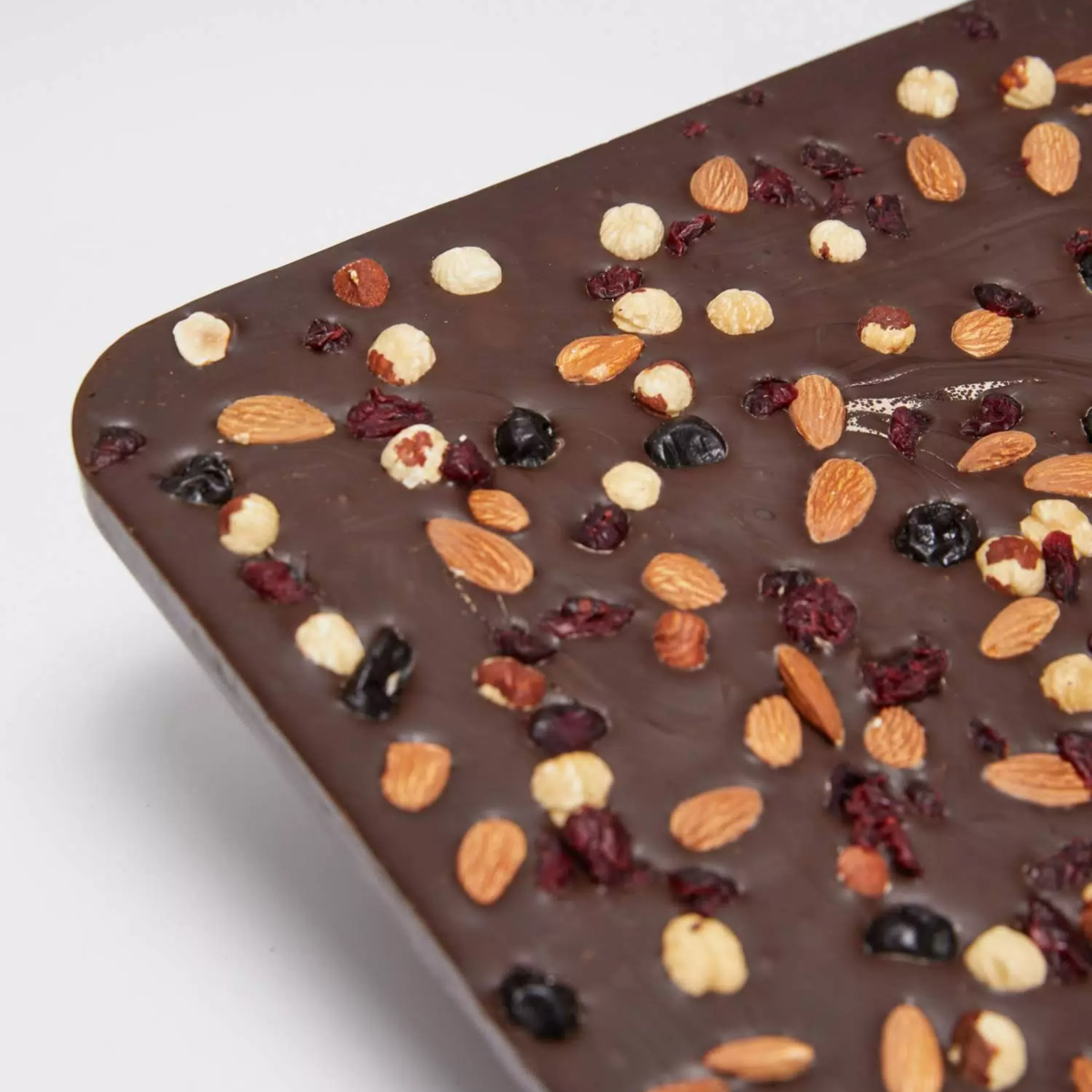 Горький шоколад весом 1 килограмм с разными натуральными и вкусными начинками. В этом сорте мы собрали микс из ягод и орехов: обжаренного хрустящего фундука и миндаля, вишни и клюквы. Вся начинка натуральная, без обработки химией и сахарным сиропом, бережной сушки и вяления — поэтому орехи и ягоды сохранили естественный яркий вкус.Миндаль и фундук плотные, хрустящие, со сладкой мякотью и без прогорклости. Вишня и клюква с вкусной плотной мякотью и сохраненной естественной природной сладостью.Начинка равномерно распределена по плитке — с какой стороны вы бы не отломили, в кусочке всегда будет много орехов и ягод.Содержание какао в плитке 65%, шоколад из благородных сортов с нежным мягким вкусом, без горечи и кислоты. Состав дополнен нерафинированным какао-маслом тех же сортов, поэтому шоколад душистый, плотный и нежно тает на языке. Большой процент какао масла в плитке делает шоколад особенно полезным, оно считается уникальным суперфудом, который оздоравливает и омолаживает организм и делает кожу красивой.Вам понравится равномерная сладость шоколада, не забивающая вкус какао и начинки. В составе настоящий тростниковый сахар. Это редкость, обычно этот вид подсластителя подделывают и выдают за него обычный свекловичный сахар.