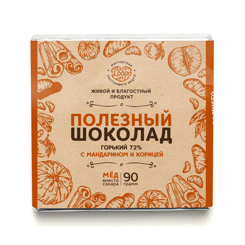 Состав: Какао тёртое натуральное, мёд пчелиный, какао масло, корица молотая, эфирное масло мандарина.Пищевая ценность (на 100 граммов продукта): белки — 7,3 гр., жиры — 45,9 гр., углеводы — 33,8 гр.Энергетическая ценность (100 гр.) — 570 ккал.Срок хранения — 9 месяцев с даты изготовления.ГОСТ 31721-2012
