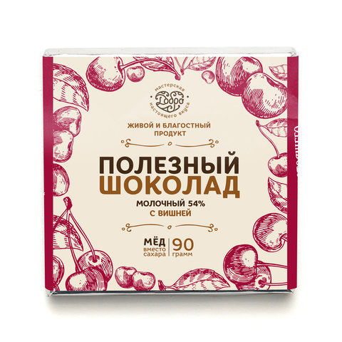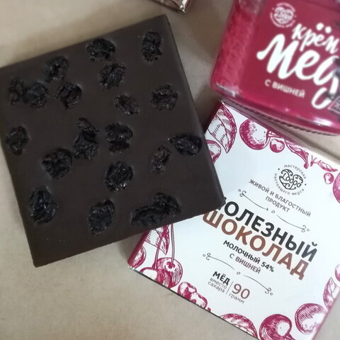 Состав:Какао тёртое натуральное, мёд пчелиный, какао масло нерафинированное, вишня сушёная, молоко цельное сухое.