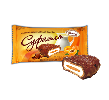 Оригинальный десерт, состоящий из хрустящего вафельного корпуса, покрытого молочно-шоколадной глазурью с дробленным миндалем или воздушным рисом с удивительно нежной сливочной начинкой-суфле со вкусом кураги.