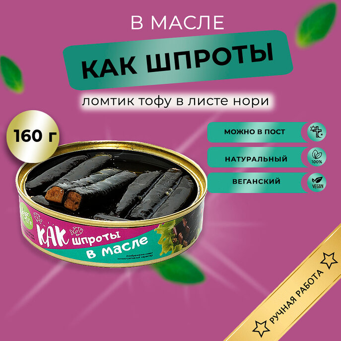 "КАК шпроты в масле": Копченый тофу (соевые бобы, Россия без ГМО, вода, соль морская, соевый соус, масло подсолнечное раф., кальций хлористый, лимонная кислота), масло подсолнечное раф., водоросли нори, смесь перцев горошком.