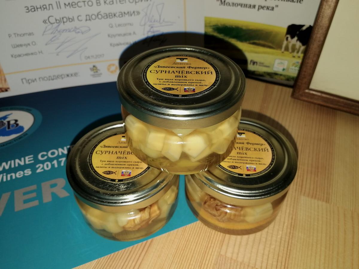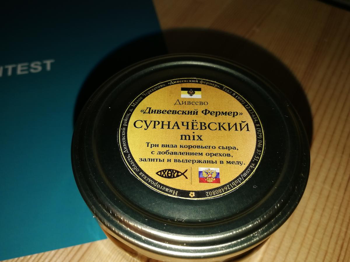 Сыр "Сурначёвский mix"- три вида сыра, из коровьего молока, нарезаны кубиками, уложены в баночку объёмом 100 миллиграмм, с добавлением орехов и залиты мёдом.