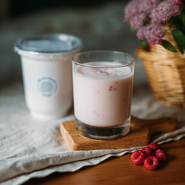 Вкусный йогурт с малиной. Сделан из молока с нашей фермы, специальной закваски для йогуртов и натуральных ягод малины. Сладкий.