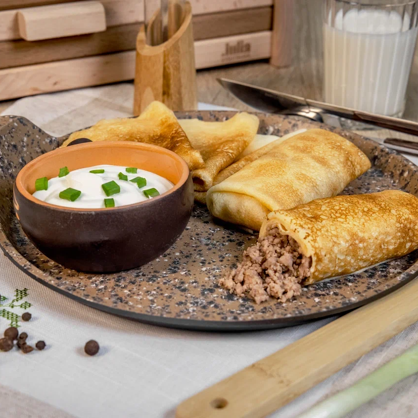 Блинчики с мясом. Состав: мука пшеничная в/с, вода питьевая, яичный меланж, молоко, масло подсолнечное, сахар, соль поваренная пищевая, свинина, говядина, лук репчатый, перец черный молотый